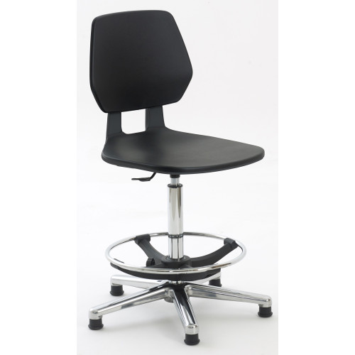 Ergonomic workshop chair fitted with cushioned washable vinyl or solid polypropylene seat and solid ..